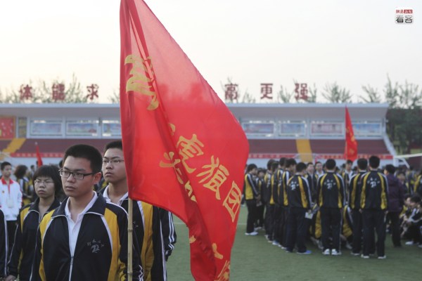 這樣的誓師大會每年都會舉行,而類似于誓師的各種勵志行動在這里都相當(dāng)常見。圖為2012年5月1日,衡水二中操場上,一名學(xué)生舉著寫有“虎狼團”字樣的旗幟參加跑操。