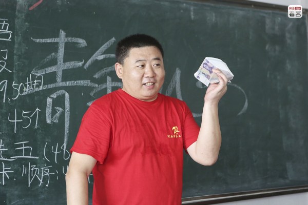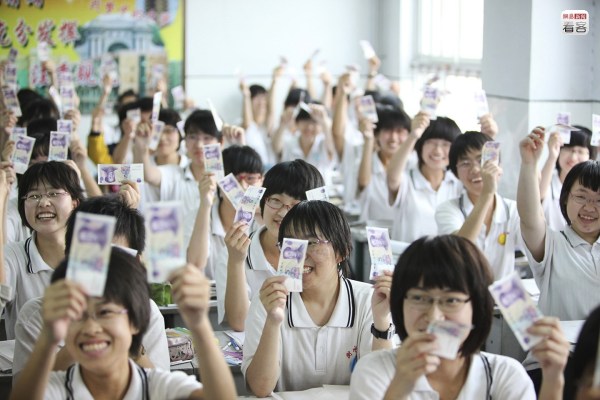 學(xué)校的另一項解壓措施是發(fā)放“回頭錢”,向每名學(xué)生發(fā)兩張五元紙幣,寓意“五谷豐登”、“十全十美”。圖為2012年6月3日,一位老師拿著一沓新紙幣準(zhǔn)備發(fā)給學(xué)生。