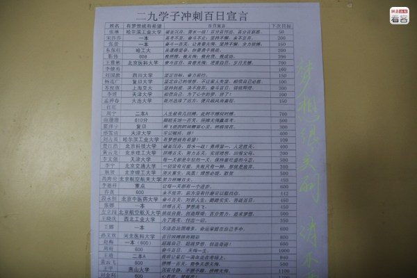圖為2009年6月1日,墻上貼著學(xué)生們在沖刺百日時寫下的誓言,每個人的目標(biāo)不同,但都會盡量具體到一個學(xué)校甚至增加多少分?jǐn)?shù),也都會留下一個“宣言”激勵自己。
