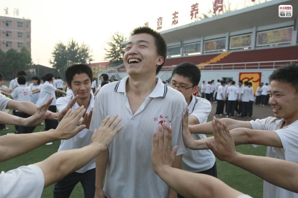 在這種壓力之下,學(xué)校也開始想方設(shè)法為學(xué)生們增加信心,有時候也會倡導(dǎo)“快樂高考”。圖為2012年5月30日,老師們帶領(lǐng)學(xué)生參加拓展訓(xùn)練以疏解壓力。