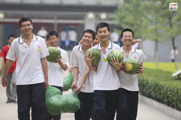 圖為2012年6月6日,學(xué)生們抱著學(xué)校發(fā)的西瓜,臨近高考,這種免費福利不少。而高考前一天晚上的晚自習(xí),老師則會帶著學(xué)生們舉行一場“西瓜宴”