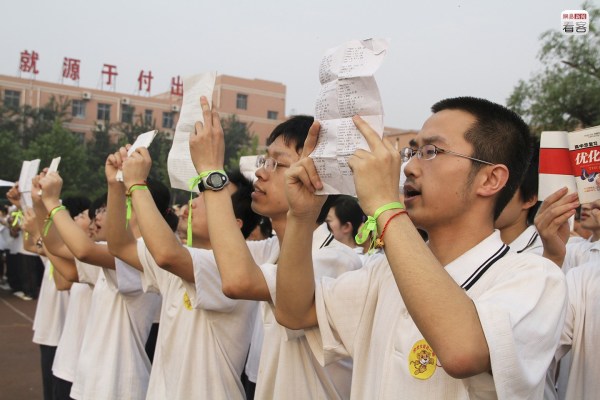 高考進行前,學(xué)校還會帶領(lǐng)學(xué)生進行最后一輪鼓勁,老師們穿著紅色T恤,背后寫著“和你在一起”,學(xué)生們則集體穿著白色T恤,在老師的帶領(lǐng)下喊口號。圖為2011年6月8日,學(xué)生們即將參加高考。