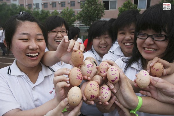 吃“幸運蛋”、過“成功門”也是學(xué)校每到高考前夕都會準(zhǔn)備的活動。圖為2009年6月7日,學(xué)生們拿著畫著笑臉的雞蛋。
