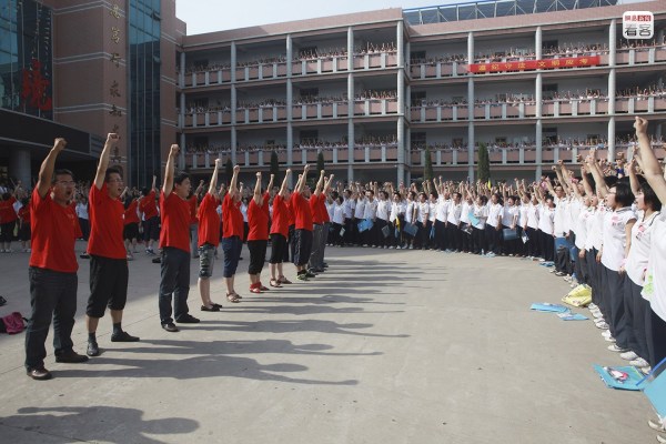 河北衡水二中,因為一段名為《衡水二中2013高考百日誓師》而走紅。該校在臨近高考100天時全校集中在操場宣誓,場面震撼,引發(fā)熱議。宣誓中,領(lǐng)講人帶著全校學(xué)生喊“一三高考,誰與爭鋒。英雄少年,唯我二中”、“決戰(zhàn)百天,我必成功!我必成功!我必成功!我必成功!”圖為2013年2月26日,學(xué)生們參加高考百日誓師大會。