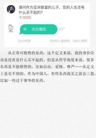 還有網(wǎng)友好奇首富獨子的消費觀,問王思聰平均在每個女朋友身上的花費是多少。王思聰給出的答案依然很實在:“從我17、8歲初戀到現(xiàn)在十幾年了,在每個女朋友身上的消費,完全取決于當(dāng)年的我有多少錢,十七八歲的時候錢也不多,或許會買的幾百幾千的飾品,但隨著自己歲數(shù)越來越大,也會買幾萬,甚至幾十萬的東西,很難算出平均的花費,有一點是確定的,隨著歲數(shù)越來越大,可支配的資金越來越多,在每個女朋友身上花的錢是越來越多的?!?/p>