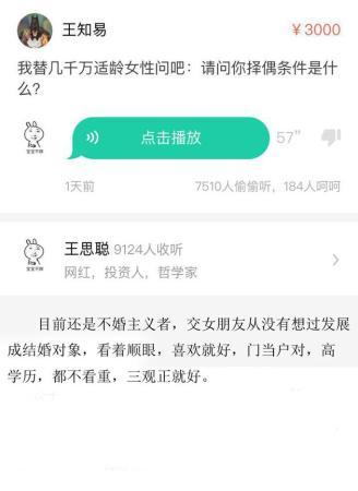 有網(wǎng)友代表幾千萬適齡女性向王思聰發(fā)問,“你的擇偶標(biāo)準(zhǔn)是什么”,王思聰坦言:“說實話,沒有考慮沒有想過這些問題,首先我目前是不婚主義者,沒想過要結(jié)婚,交女朋友有交,但從沒想過發(fā)展成結(jié)婚對象,至于交女朋友標(biāo)準(zhǔn),其實沒什么標(biāo)準(zhǔn),我喜歡就好,我和一般傳統(tǒng)家庭或是老一代的人思想不太一樣,沒想過要門當(dāng)戶對,高學(xué)歷啊,知書達理啊這些,都不是很看重,三觀正比較重要,再就是我喜歡,我看順眼就好,其他真的沒別的標(biāo)準(zhǔn)了?!?/p>