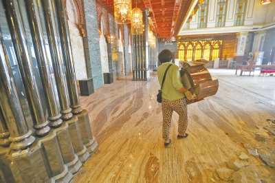 大廳內(nèi),金碧輝煌的樓頂和墻體以及各種燈飾等都還沒有拆除,大廳東側(cè)的一處1尺高的平臺(tái)正在拆除。在切割、拉扯、裝卸等雜音交響中,東北角一名工人拿著大錘對(duì)著室內(nèi)非承重墻猛砸,已砸出一個(gè)大窟窿。很顯然,這里正進(jìn)行大規(guī)模拆除。