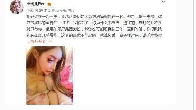 近日,曾有“第一網(wǎng)紅”之稱的嫩模王瑞兒在微博發(fā)文自曝被男友嚴重家暴,她大膽曬出右眼紅腫不堪、嘴角流血的“被虐打”慘狀,并稱胸被打到“變形幾乎爆炸”,和劉梓晨神似龍鳳胎。據(jù)稱,王瑞兒整容過的假胸價值高達百萬。王瑞兒自稱與男友交往三年,大方承認最初在一起是貪圖對方“有錢”,三年來遭受了無休止的虐待和毆打,此次更是變本加厲險些將胸“打爆”,這才怒而提出分手:“請你滾蛋,從此遠離我的生活……如果再跟你在一起,我將萬劫不復!”