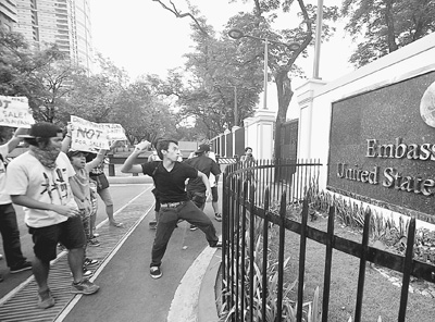 4月16日,在菲律賓首都馬尼拉,抗議菲美聯(lián)合軍演的示威者向美國(guó)駐菲大使館外墻投擲顏料。新華社發(fā)