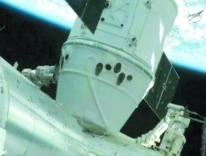 5月25日,“龍”飛船被安全固定在國(guó)際空間站的“和諧”號(hào)節(jié)點(diǎn)艙上。新華/法新