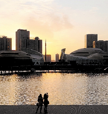 昨天又是一個好晴天,夕陽西下,給鄭東新區(qū)如意湖繪上夢幻般色彩。