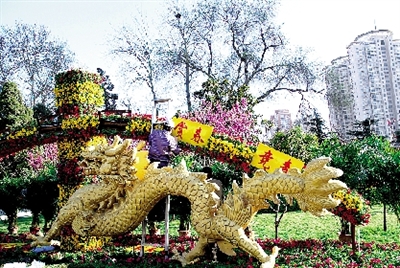 此次花展分別布置了“雙龍競春”、“綠島探春”等5個(gè)立體和平面花壇,有配花如牽?;ā⑷赖葍扇f余盆,另有袖珍葉子、散尾葵、綠茉莉、夏威夷等近千盆點(diǎn)綴,其中景點(diǎn)“樂童嬉春”的“魔方”使用7000余枝鮮切花康乃馨制成。
