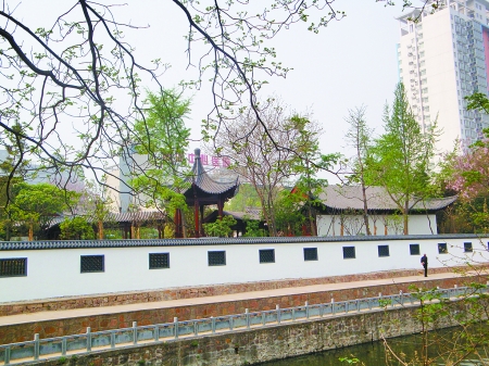 昨日上午,記者在現(xiàn)場看到了這座袖珍式高檔花園,其外部是兩米高的圍墻(如圖)。遠(yuǎn)遠(yuǎn)看去,里面亭臺樓閣樣樣俱全,還栽滿各色花木。透過墻上的鏤空窗,記者看到木質(zhì)長廊將各建筑連為一體,園子正中還堆有假山。有工作人員正在里面施工,出入口則設(shè)立著擋板。有市民質(zhì)疑稱,現(xiàn)在不少地方都拆墻透綠了,這么好的景致為何圍上不讓欣賞。