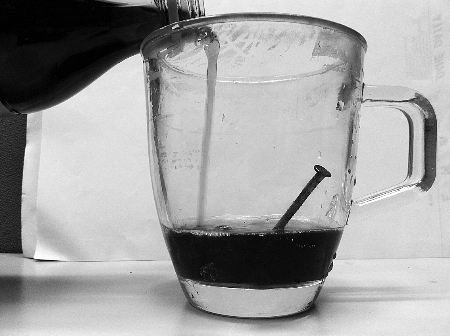 昨天中午12點,記者針對微博上熱炒的“可樂去銹”事件,買來某品牌500毫升可樂一瓶,隨后將兩枚4厘米長銹跡斑斑的鐵釘放入透明的6厘米高的玻璃杯子里,開始做浸泡實驗。