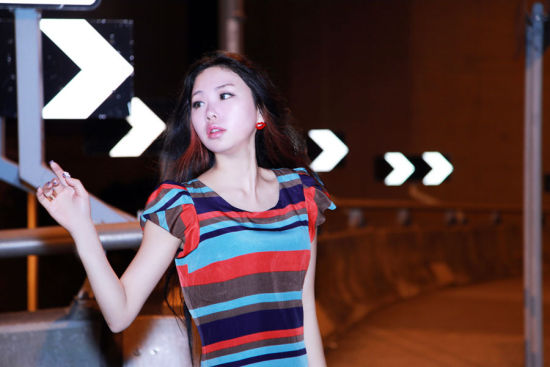 看香港的夜景很美,條紋修身裙。