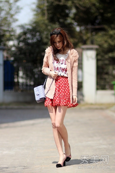 淺粉色立體花針織開衫,很清甜可愛的風格,穿在身上有種溫婉的氣息,內搭白色T恤下穿白色波點紅色短裙,拼接高跟鞋,優(yōu)雅魅力十足。
