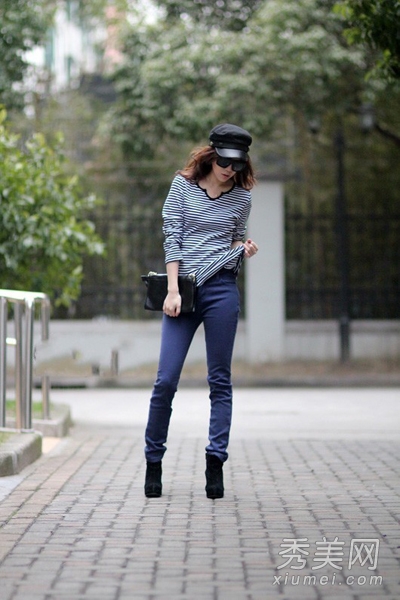 藍色條紋長袖T恤搭配藍色鉛筆褲,喜歡藍色的女生可以學學這身搭配,比較簡單但很有氣場。配上蓋帽和同色高跟鞋,挺有歐美風格。