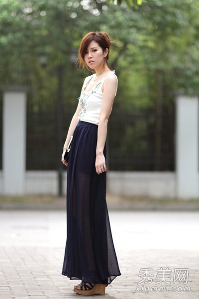 白色背心搭配黑色半身長裙,還是透視感的款式,特別有T臺的感覺。簡約的黑白配清新淡雅,散發(fā)著一種低調的時尚感。