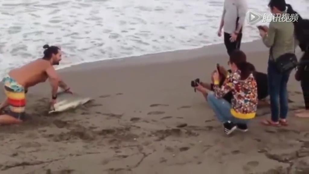 實(shí)拍男子將擱淺鯊魚強(qiáng)行拖上岸合照