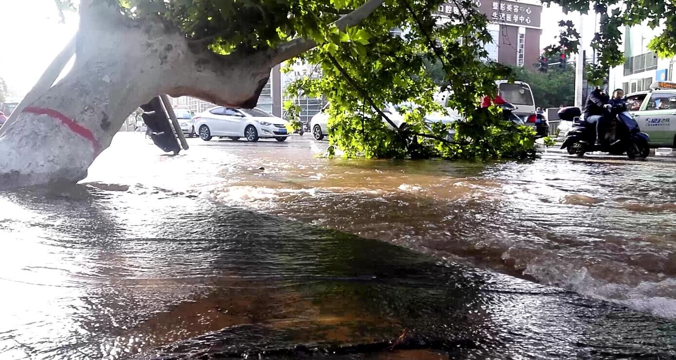 鄭州表情:鄭州水管爆裂 沖倒大樹(shù)線桿
