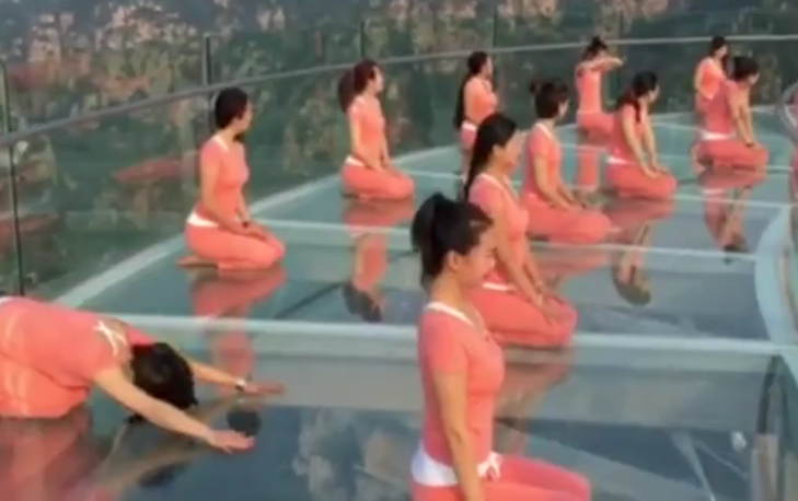 • 實(shí)拍百人懸空玻璃觀景臺上練瑜伽