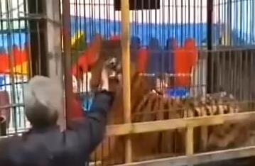 老人伸手進(jìn)籠 被老虎一口咬住