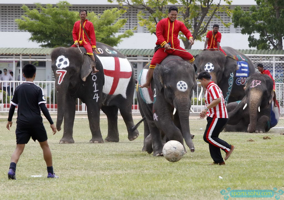 學(xué)生們與身上畫有世界杯參賽球隊(duì)國旗圖案的大象踢足球
