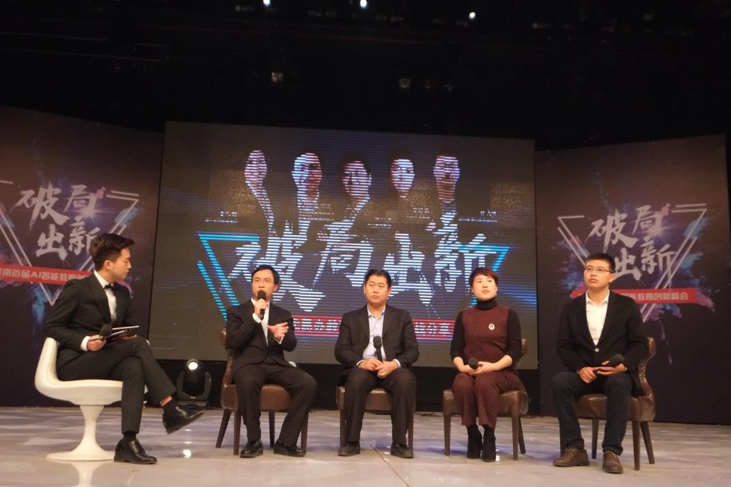 最后,美克創(chuàng)客創(chuàng)始人韓可蘇先生、 大山教育集團(tuán)董事長(zhǎng)張紅軍先生、現(xiàn)代教育集團(tuán)運(yùn)營(yíng)總監(jiān)董文靜女士、鄭州星源外國(guó)語學(xué)校校辦副主任張高峰先生圍繞著《AI時(shí)代民辦教育智能創(chuàng)新實(shí)戰(zhàn)經(jīng)驗(yàn)分享》的話題進(jìn)行了圓桌論壇。四位嘉賓分別從社會(huì)熱點(diǎn)到教育理念展開實(shí)戰(zhàn)分享,充分展望未來AI技術(shù)與教育結(jié)合的創(chuàng)新方向。