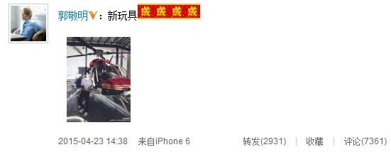 4月23日下午,郭敬明在微博曬出一張與一架直升機(jī)的合照,炫富炫出了新高度。
