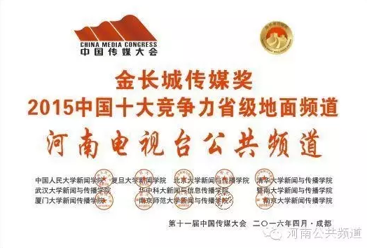 河南公共頻道報(bào)榮獲“金長城傳媒獎·2015年中國十大競爭力省級地面頻道”榮譽(yù)。