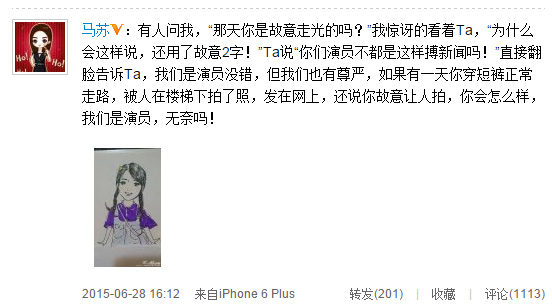 前天(6月26日),演員馬蘇參加某代言活動(dòng),下樓梯時(shí)被媒體拍到,稱(chēng)其“疑似走光露臀部”。6月28日下午,馬蘇在微博公開(kāi)回應(yīng)此事,稱(chēng)“演員也有尊嚴(yán)”。