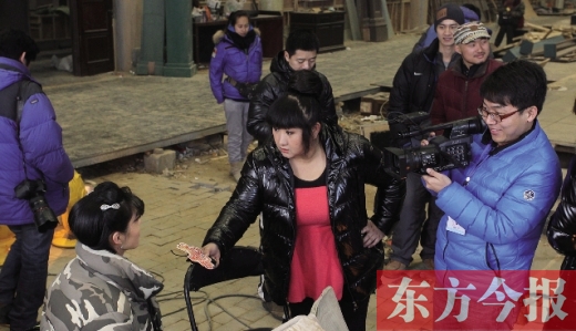 雖然“美食街”上人跡罕至,然而當(dāng)節(jié)目組來(lái)到《大河兒女》的攝影棚時(shí),卻發(fā)現(xiàn)這里人頭攢動(dòng)。劇中的明星大腕、劇組工作人員、媒體記者將這里圍得水泄不通。而香香最關(guān)心的則是:來(lái)河南拍戲的明星們?nèi)绾慰创幽厦朗衬??為?tīng)到他們的心聲,香香客串起了娛樂(lè)記者。