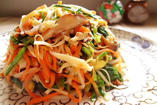 《金陵歲時記》記載了南京人除夕的“十景菜”(也叫什錦菜),人們以醬姜、黃瓜、胡蘿卜、金針菇、木耳、冬筍、白芹、醬油干、百葉、面筋十種,細切成絲,以油炒之,這就是所謂的“十景”。這些菜都有著美好的寓意:黃瓜,象征瓜瓜連連、子孫蔓延;冬筍,象征雨后春筍節(jié)節(jié)高;百葉,象征百依百順樣樣順,都是要討個吉利的口彩?,F(xiàn)在的什錦菜已經(jīng)不止10種了,甚至多達16-18種,增加了藕,象征路路通;黃豆芽,象征如意;薺菜,象征聚財;馬齒莧,南京又稱安樂菜,象征平安喜樂。