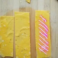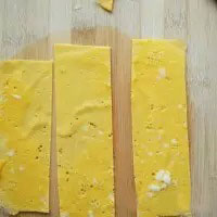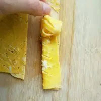 1. 雞蛋打散加少許鹽,淀粉加少許水調(diào)勻,加在蛋液中攪拌均勻,平底鍋小火,倒入蛋液,煎成薄薄的蛋皮,切成寬約4厘米的長條。