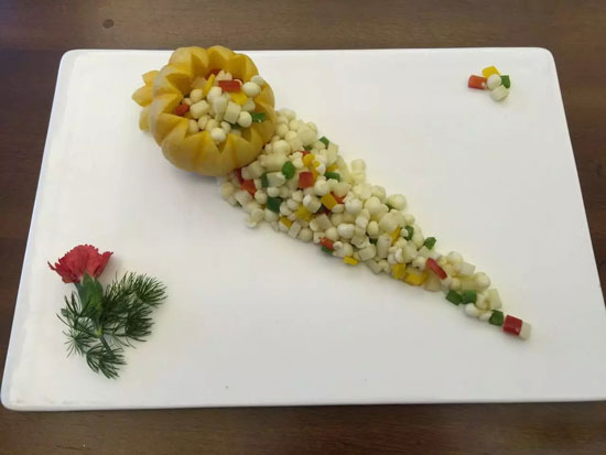 4.把山藥丁,芡實(shí),青椒焯水,炒制,加入鹽,蘑菇粉,流水芡調(diào)味。裝入金瓜即可。