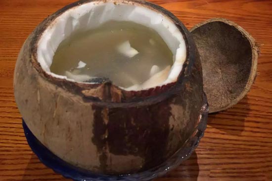 4、海椰皇用搗碎器敲去外殼,將椰內洗凈對切成兩半。