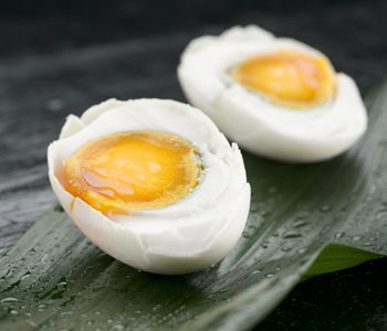 取花椒、桂皮、茴香、生姜、精鹽,用等量水煮沸20分鐘,倒入一瓷壇內(nèi),將洗凈的鴨蛋泡入,封嚴(yán)壇口,40天后即可煮食。這種鴨蛋香味濃郁,微咸可口。