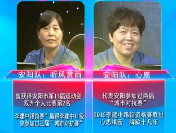 雖然來(lái)的是兩名女隊(duì)員,但是人家巾幗不讓須眉?!奥?tīng)風(fēng)賞雨”曾獲得安陽(yáng)市第11屆運(yùn)動(dòng)會(huì)雙升個(gè)人比賽第2名;2015年“李建中踢館賽”領(lǐng)先李建中11級(jí);參加過(guò)三次“河南電視雙升城市對(duì)抗賽”?!靶脑浮痹?015年“李建中踢館資格賽”中勝出;代表安陽(yáng)隊(duì)參加過(guò)兩屆“河南電視雙升城市對(duì)抗賽”,牌齡十幾年。