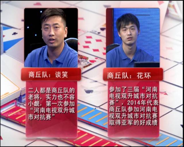 商丘隊(duì)派出了“花環(huán)”和“談笑”。兩人都是商丘隊(duì)的老將,實(shí)力不容小覷。“花環(huán)”曾參加三屆“河南電視雙升城市對(duì)抗賽”;2014年代表商丘隊(duì)參加“河南電視雙升城市對(duì)抗賽”,并取得亞軍的好成績(jī)?!罢勑Α钡谝淮螀⒓印昂幽想娨曤p升城市對(duì)抗賽”。
