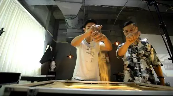 沙子的厚薄出來的效果,就是我們中國畫的墨分五色,所謂墨分五色就是濃淡干濕燥,其中的奧妙就是沙子和燈光的完美結(jié)合。