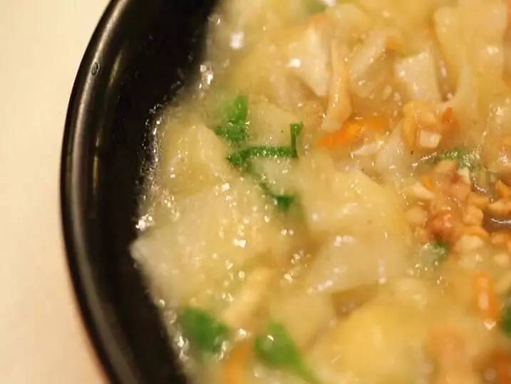 用勺子一攪就感受到了那黏糊勁兒,入口糊涂的香氣就散開了。面條已經(jīng)被煮斷,但吃起來還有筋筋的感覺。軟軟的胡蘿卜絲和油炸豆腐絲、還有脆爽的青菜段和面面的黃豆,混在一起滾燙咸香,滋味很足。微辣的蒜油也添了幾分香氣,很有家的味道。