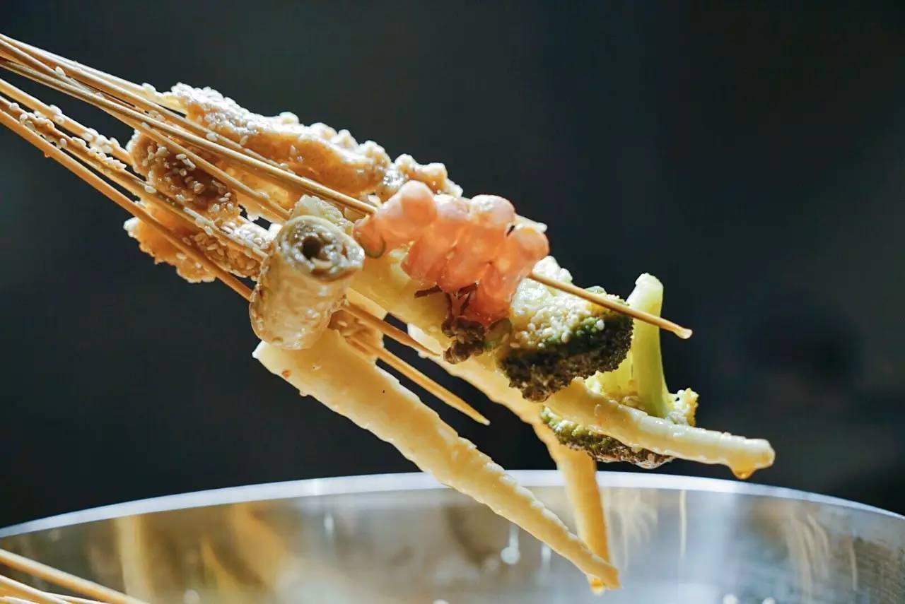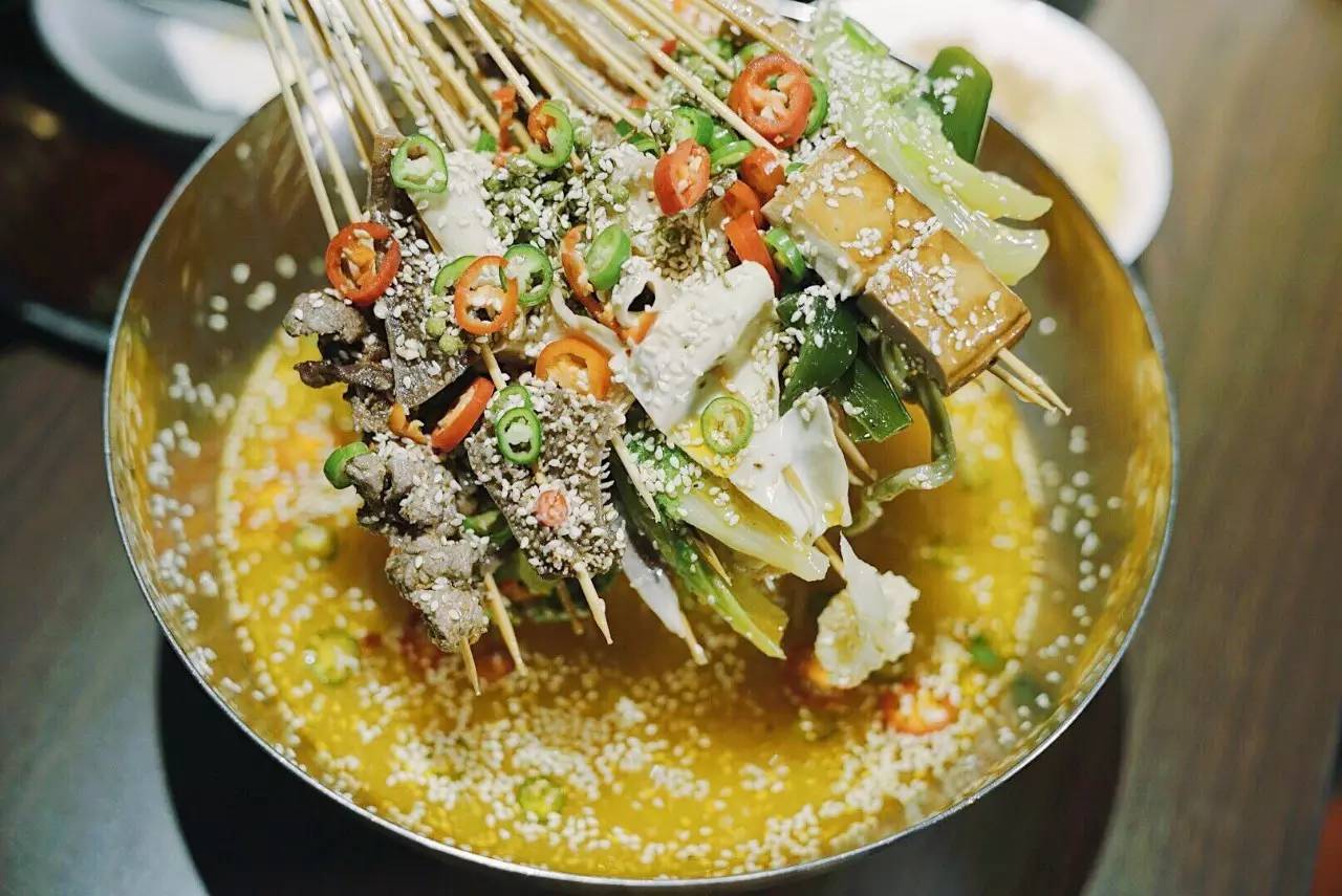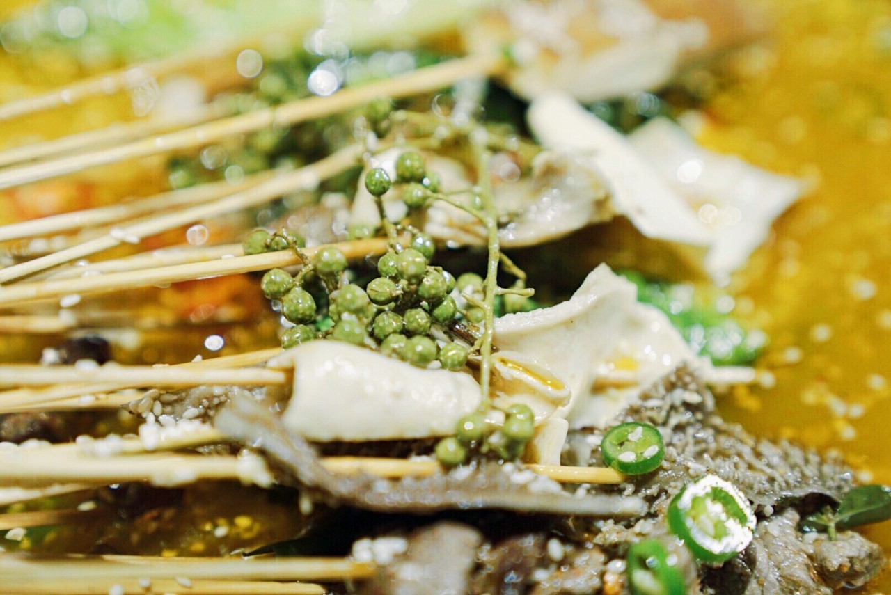 重慶喜辣更江湖,成都重麻更市井。而椒麻鍋底的冷鍋串,就是成都特色。藤椒芝麻和小米辣的放入,讓鍋底有了香麻的口感。青白兩色的搭配,看起來(lái)也特別清爽。
