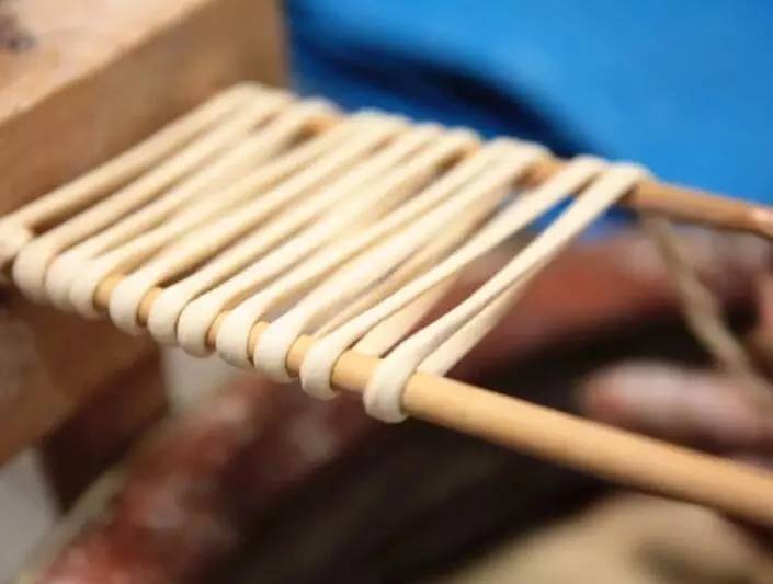 接下來的上面非??简?yàn)眼力和手指的靈活度,搓細(xì)的面以八字結(jié)繞在木棍上,上下飛舞卻紋絲不亂,看的人眼花繚亂。上好的面條根根粗細(xì)均勻間距相同,精致的如同工藝品。