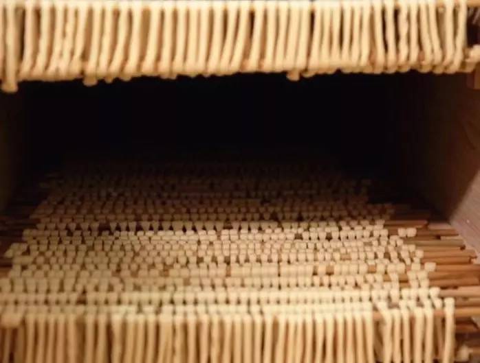 如果以為眼前這潔白如絲的面條就是人主掛面,那你就錯(cuò)了。面條晾到七八成干時(shí),將底部的木棍拿起反向插到架子上最終成型。這漁網(wǎng)狀絕對(duì)是人主掛面最獨(dú)特的標(biāo)志。