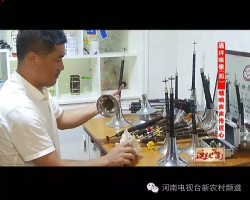 在通許,有很多嗩吶班子,其中以武氏嗩吶最有名望。武華銘是武氏嗩吶的第五代傳承人,8歲開始練嗩吶,如今已經(jīng)掌握了嗩吶演奏的各種技巧。吹奏喜調(diào)輕盈歡快,悲調(diào)憂傷深沉。音質(zhì)純凈,令人回味無窮。