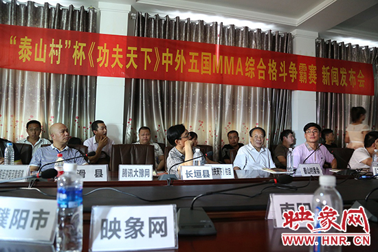 映象網(wǎng)訊(記者 袁野)2016年8月14日上午10點,由新鄭市龍湖鎮(zhèn)泰山村委會冠名主辦、河南電視臺新農村頻道與河南登封少林寺塔溝武術學校協(xié)辦、《功夫天下》欄目承辦的“泰山村”杯《功夫天下》中外五國MMA綜合格斗冠軍爭霸賽新聞發(fā)布會在泰山村委會黨員活動室召開,來自鄭州的十余家主流媒體代表和來自全省各地市的自媒體代表團濟濟一堂,共同見證這一盛大賽事的開幕。