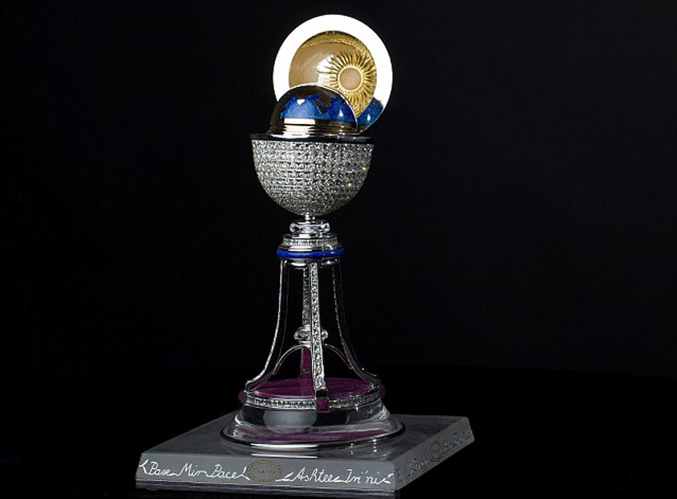 打開“幻影蛋”蛋殼后,可以看到里面裝飾華麗的迷你地球儀。將地球儀頂端提起,里面是用無(wú)色水晶雕成的白鴿,棲息在黃金橄欖枝上,還有黃金手工雕刻的“世界和平”字樣。這個(gè)“幻影蛋”是精英工匠歷時(shí)3年方才打造完成的。