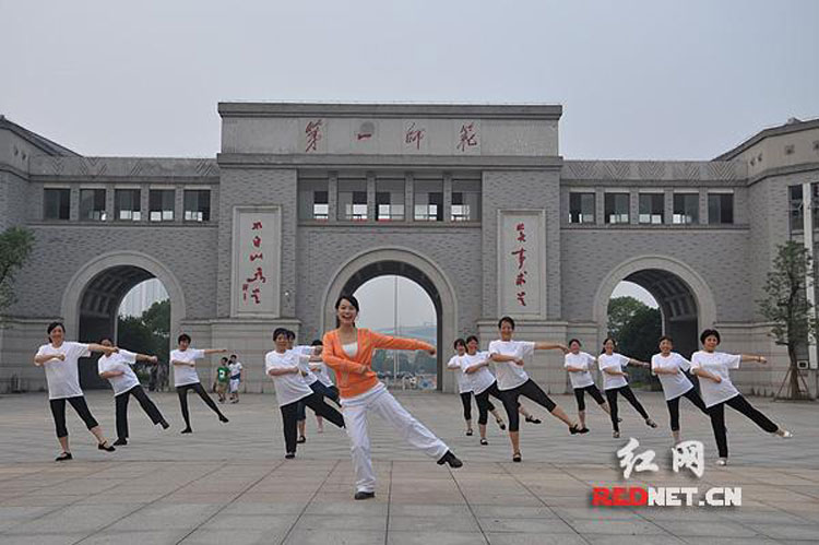 紅網(wǎng)長沙訊(記者廖潔)沒有吵鬧的音樂,動作優(yōu)雅舒展,6月13日傍晚,在湖南第一師范學院前坪,中老年教師們練習的一種特別的廣場舞十分引人注目。