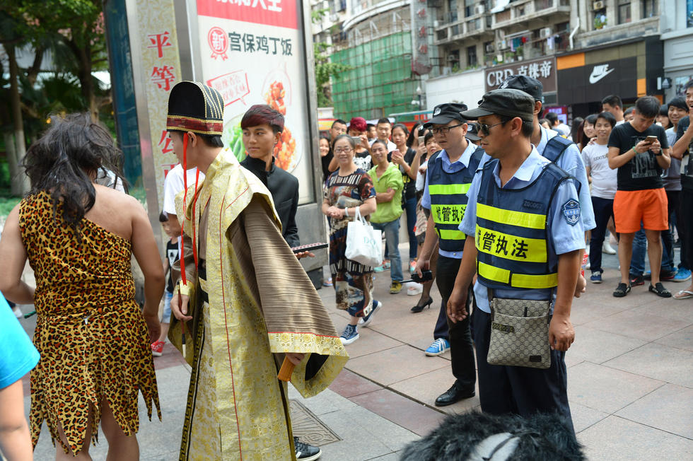 2015年9月13日,湖北武漢江漢路上,6名男青年玩“穿越”情景劇,引起許多好奇的群眾圍觀。由于他們的活動事先沒有辦證,活動進行5分鐘后,他們就被迅速趕來的城管執(zhí)法隊員勸離。