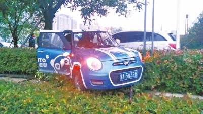 昨日上午10時許,大河報記者跟著鄭州市公安局交巡警支隊直屬六大隊民警,來到鄭東新區(qū)CBD如意湖畔的千璽廣場。事故發(fā)生地點位于千璽廣場西南側(cè)的一處廣場上,這里有一處共享汽車停車場。記者發(fā)現(xiàn),這里共有6輛共享汽車,出事的豫A5A32B共享汽車是一輛藍(lán)白色搭配的力帆汽車,停在綠化帶內(nèi),車身有碰撞痕跡。停車場東北角,一輛白色豫A牌照奔馳轎車左前臉位置受損。